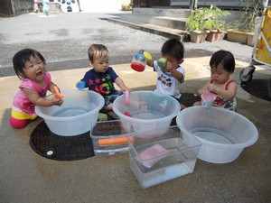 赤ちゃんもプールの周りで水遊び!