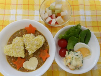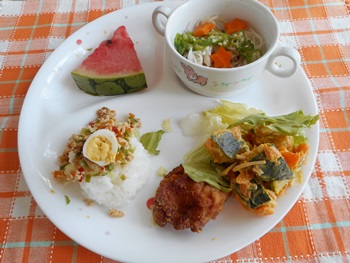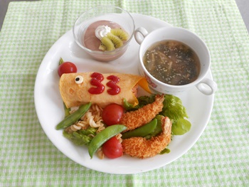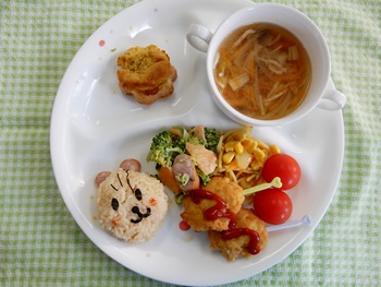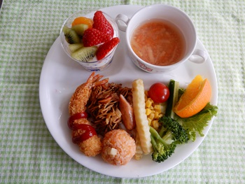 子どもたちのすきな、 チキンライスボールチーズ入り、エビフライ、フライドポテトなど ボリュームメニューでした。