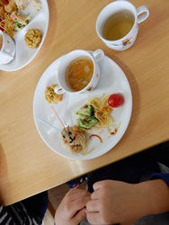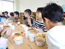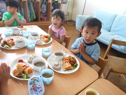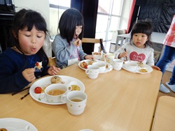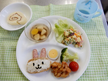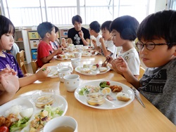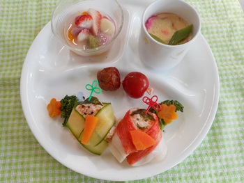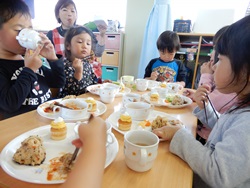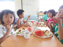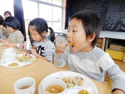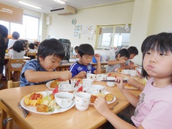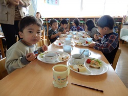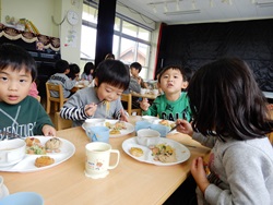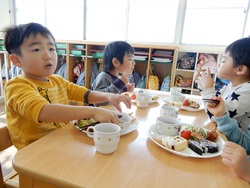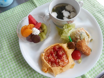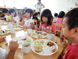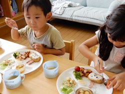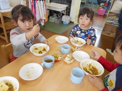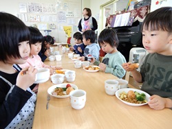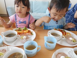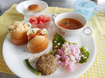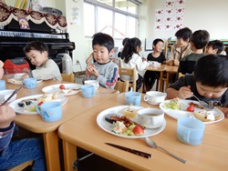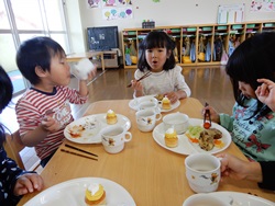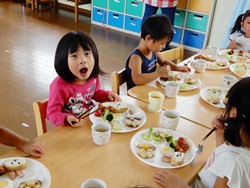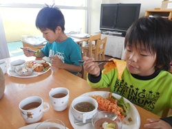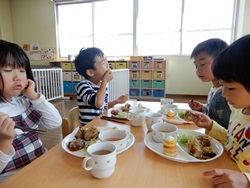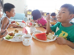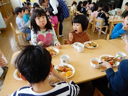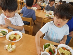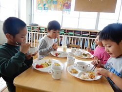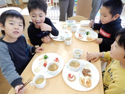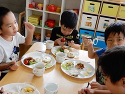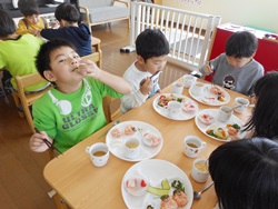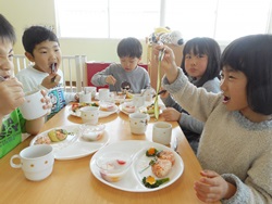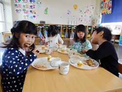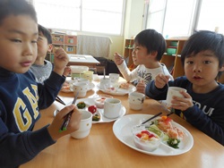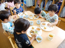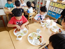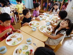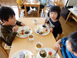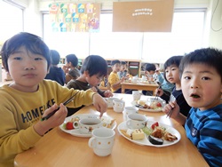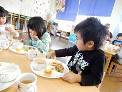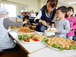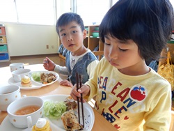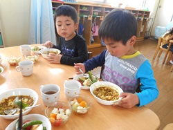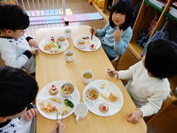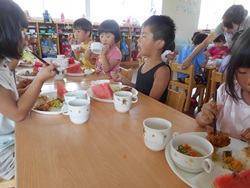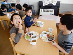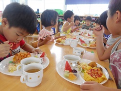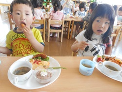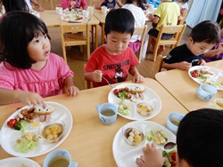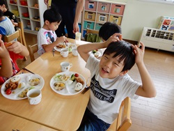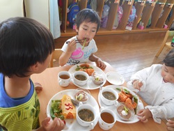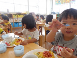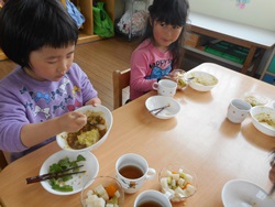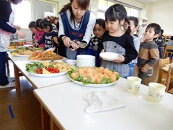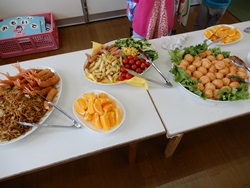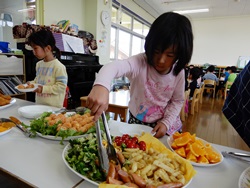先生に、教えてもらい自分たちで好きな物を、 食べれる量とってもらいました。 なかなか、トングの使い方が難しいようでした。 どきどき、しながらも楽しいバイキングで、 子ども達は何回もおかわりしてました。 なかでも、チキンボールは好評でよかったです!