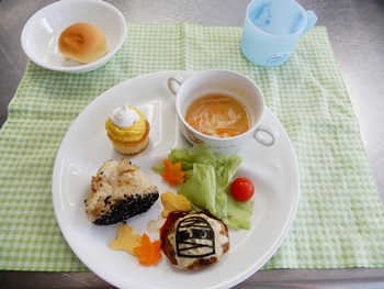 今月は、秋を感じる栗のかたちおにぎり ハロウィンハンバーグ、 いちょうやもみじも浮かべてみました。