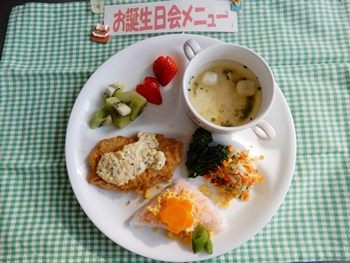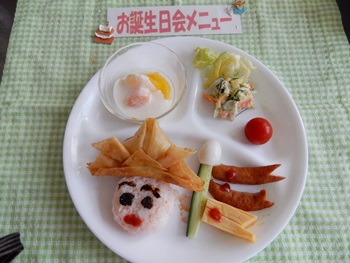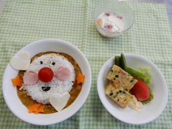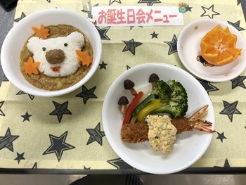 今月のお誕生日会は、 みんなの大好きなカレーに、 くまさんが微笑んでいます。 大きなエビフライには、 たっぷりのタルタルソース、 子供たちは、大喜びで、 「おいしそー」「おっきー」 と、楽しそうに食べていました。