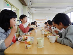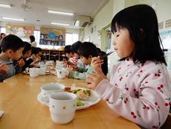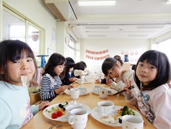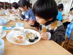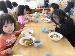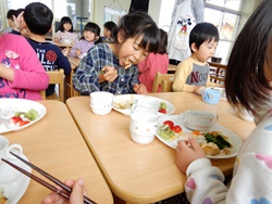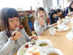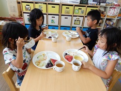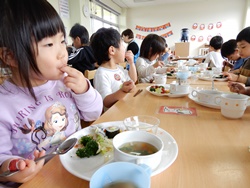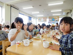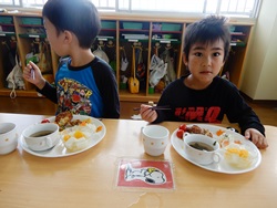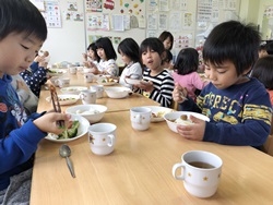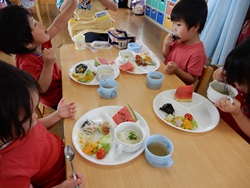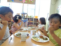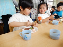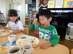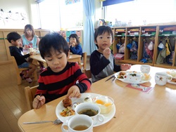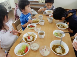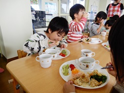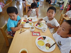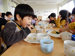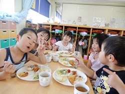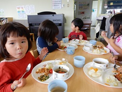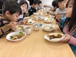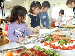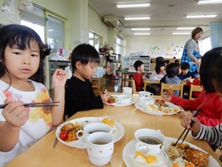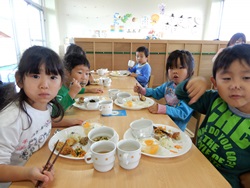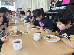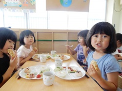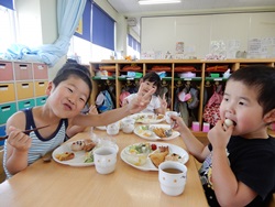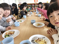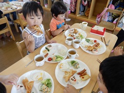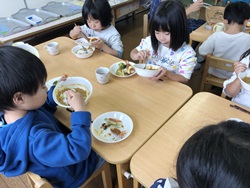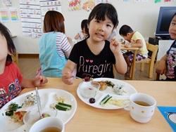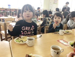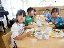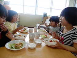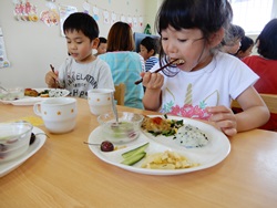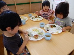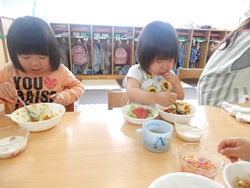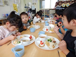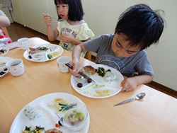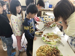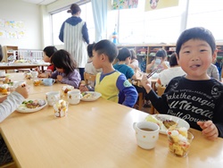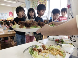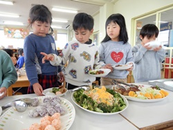 おかわりは、自分たちで食べられる量をとり、 好きなもの食べたいもの、みんなお野菜もとり 自分でとる楽しみ、お友達と一緒に楽しく食べるという、 食育もできたと思います。
