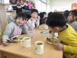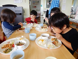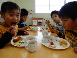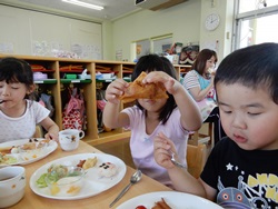 今月のハンバーグはミートローフ風だったため、 ボリュームもあり、ソースもたっぷりなので、 腕まくりして、服につかないように工夫していました。 今月も、楽しそうに、元気な笑顔がたくさんみられました!