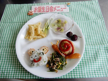 6月のお誕生日会は、 梅雨をイメージして、 カエル、かたつむり、あじさいを、 プレートにしてみました。 カエルのおにぎりは、 わからなかったみたいですが、 かたつむりハンバーグは、 ボリュームもあって、 みんな喜んでたべてました!