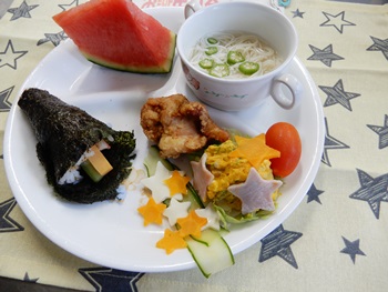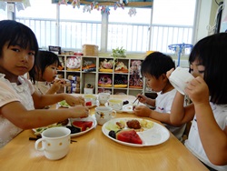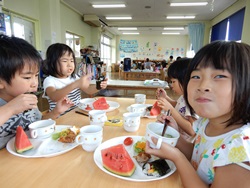今旬のすいかは、 おかわり何回もしている子もいてびっくりしました。 やっぱり、から揚げは一番人気、 あっという間に食べてくれていました。 好きなものは、早めにたべるみたいで