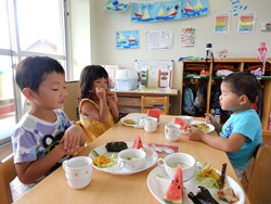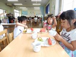 スイカは、今年保育園の畑でたくさんできて、 みんな今年ほど食べたことないというぐらい たくさん食べることができました。 園長先生や近所の方々に感謝して食べました。 残りわずかなスイカも、夏らしさを演出してくれました。 みんなの笑顔で美味しさが伝わってきますね。 いっぱい食べて、夏バテを、吹き飛ばしましょう!