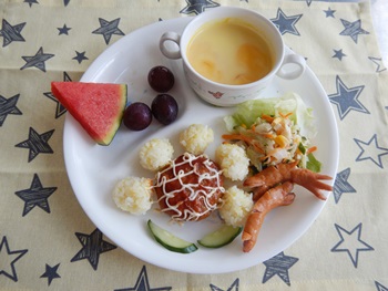 今月は、ひまわりハンバーグで 夏をイメージして、 子供の握りやすいまあるい カレー味のおにぎりにしてみました。 自分で、つまんでたべられます。