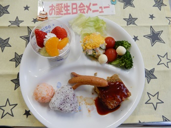 今月のお誕生日会は、秋も深まり 紅葉や銀杏を感じてもらおうと、 秋のものいっぱいメニューにしてみました! きのこのてんぷら、さつまいもごはん、 麩もみじは、色もきれいだし 目新しいため注目の的で、 『これ何?きれい』と感動してましたね。