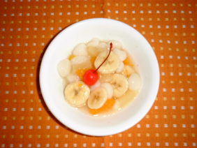 3.団子、フルーツ、シロップをあわせる。