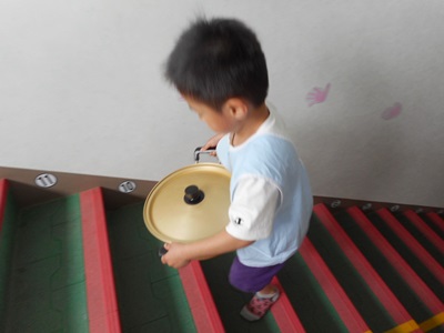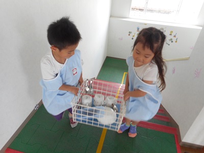 その日のお当番さんが給食室に給食をもらいに来ます。