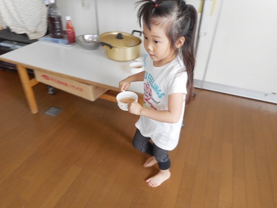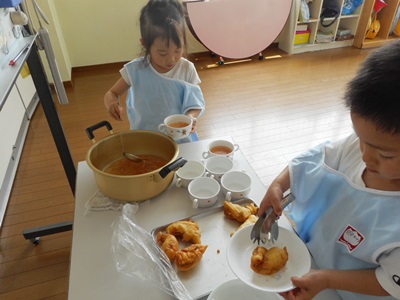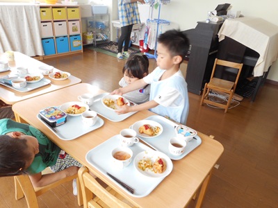 年長のひまわり組さんは今月から学校給食の体験をしています。