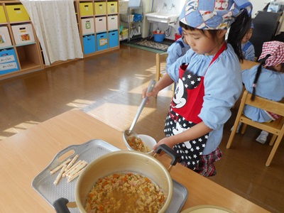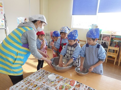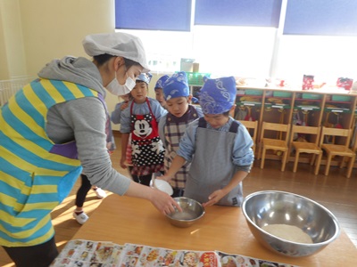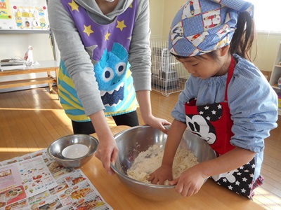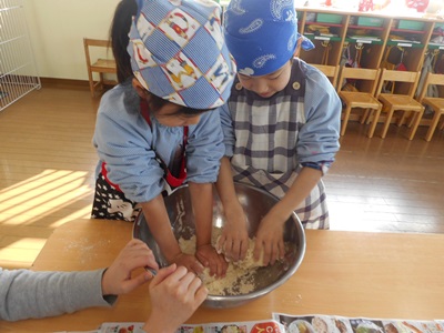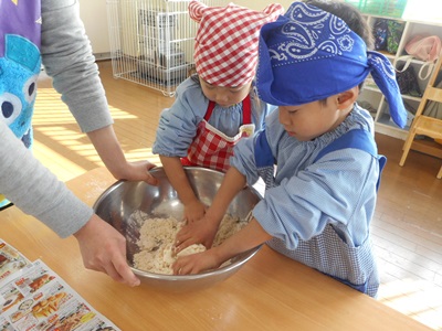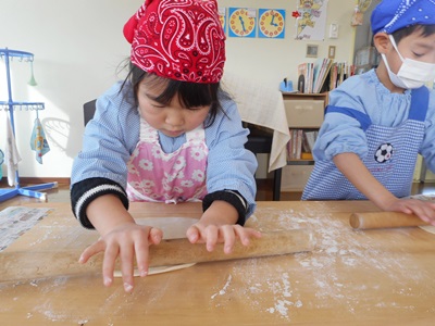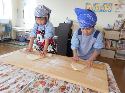 生地を二つに分け、子どもたちに踏んでもらいます。