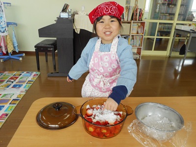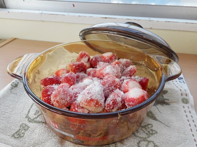 午後になった頃には。。。 イチゴから水分が出てきています。