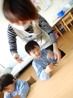 伝えてきました。バーンとは鉄砲。えんぴつの持ち方と一緒です。 この持ち方をしてもらっておくと、お箸へのスムーズな移行が出来ます。