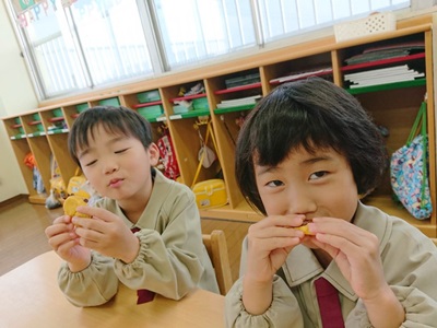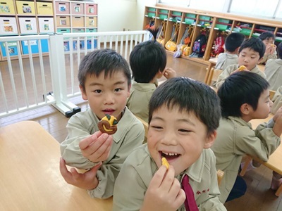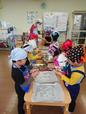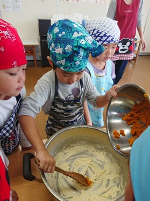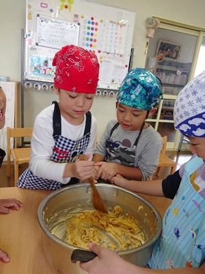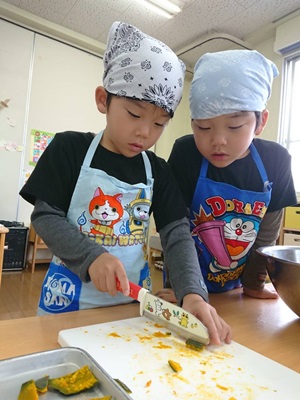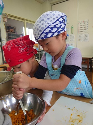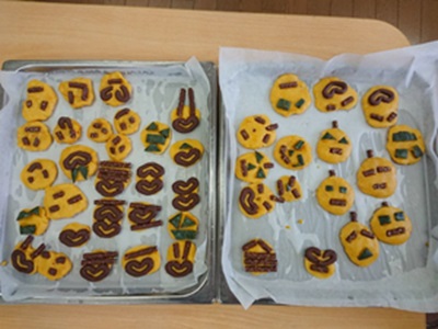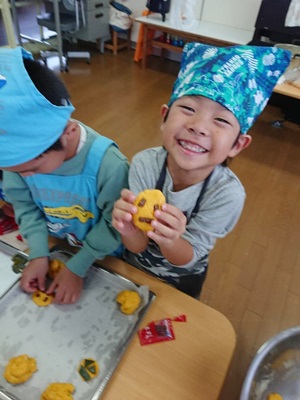 今月は、ひまわり組さんと かぼちゃを使ったハロウィンクッキーを作りました。