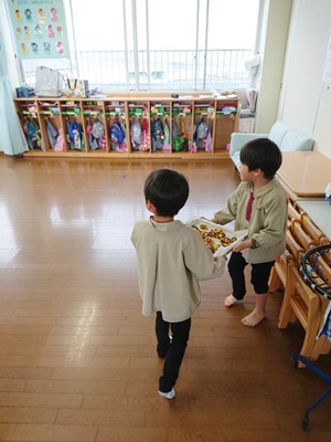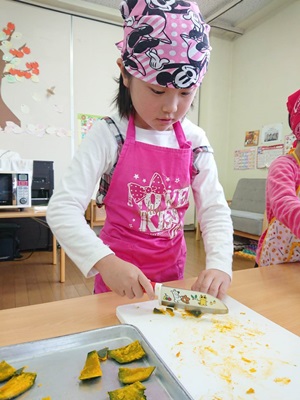 その間に、他の子はかぼちゃの皮を何やら小さく切っています。