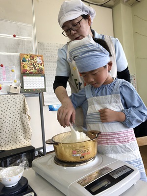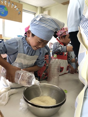ざるにお米を入れて、子供たちが研ぎやすいようにします。