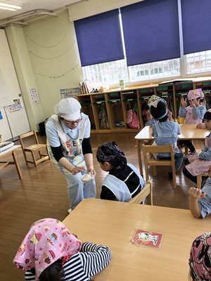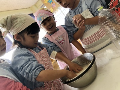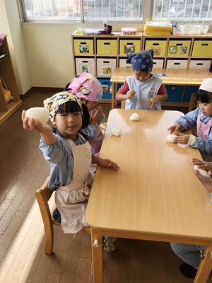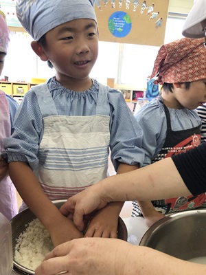 ラップにご飯をのせて おにぎりをつくっていきました。 丸や三角、いろんな形が出来ました みんなで給食のとき食べました。 日頃の倍のご飯をたべましたよ。